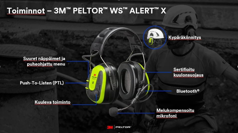 Peltor Headset WS Alert X:ssä kuulonsuojaimessa on aktiivinen kuulonsuojaus, joka tarjoaa korkean, jopa 30 dB:n vaimennuksen. Melua vaimentava mikrofoni jolla Peltor WS Alert X on varustettu, on tämän kuulonsuojaimen tärkeimpiä ominaisuuksia. Tämän ansiosta voit kokea selkeän äänensiirron meluisissa ympäristöissä, kun soitat handsfree-puheluita. Samalla ympäristön kuuntelutoiminto varmistaa, että vaimeat äänet ja varoitussignaalit vahvistuvat. Voit kytkeä sen päälle milloin tahansa muutamassa sekunnissa push-to-listen toiminnon avulla. Näin ympäristönhavainnointikykysi ei heikkene kuulosuojaimia käyttäessäsi. Kuulonsuojaimet voidaan asentaa ja ohjata erityisen helposti ja kätevästi 3M:n Connected Equipment -sovelluksen kautta älypuhelinta käyttäen.