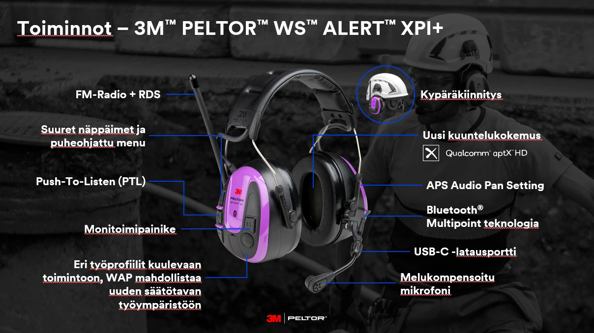 Uusi 3M Peltor WS Alert XPI+ kypäräkiinnityksellä on päivitetty malli edeltäjästään WS Alert XPI, joka tarjoaa uusia ominaisuuksia sekä tyylikkäät lilanväriset kupuosat ja päälakisangan. Kuulonsuojaimissa on sisäänrakennettu litiumioniakku, joka ladataan kätevästi USB-C-liitännän kautta. Huom! USB-C-latauskaapeli ei sisälly pakkaukseen.
