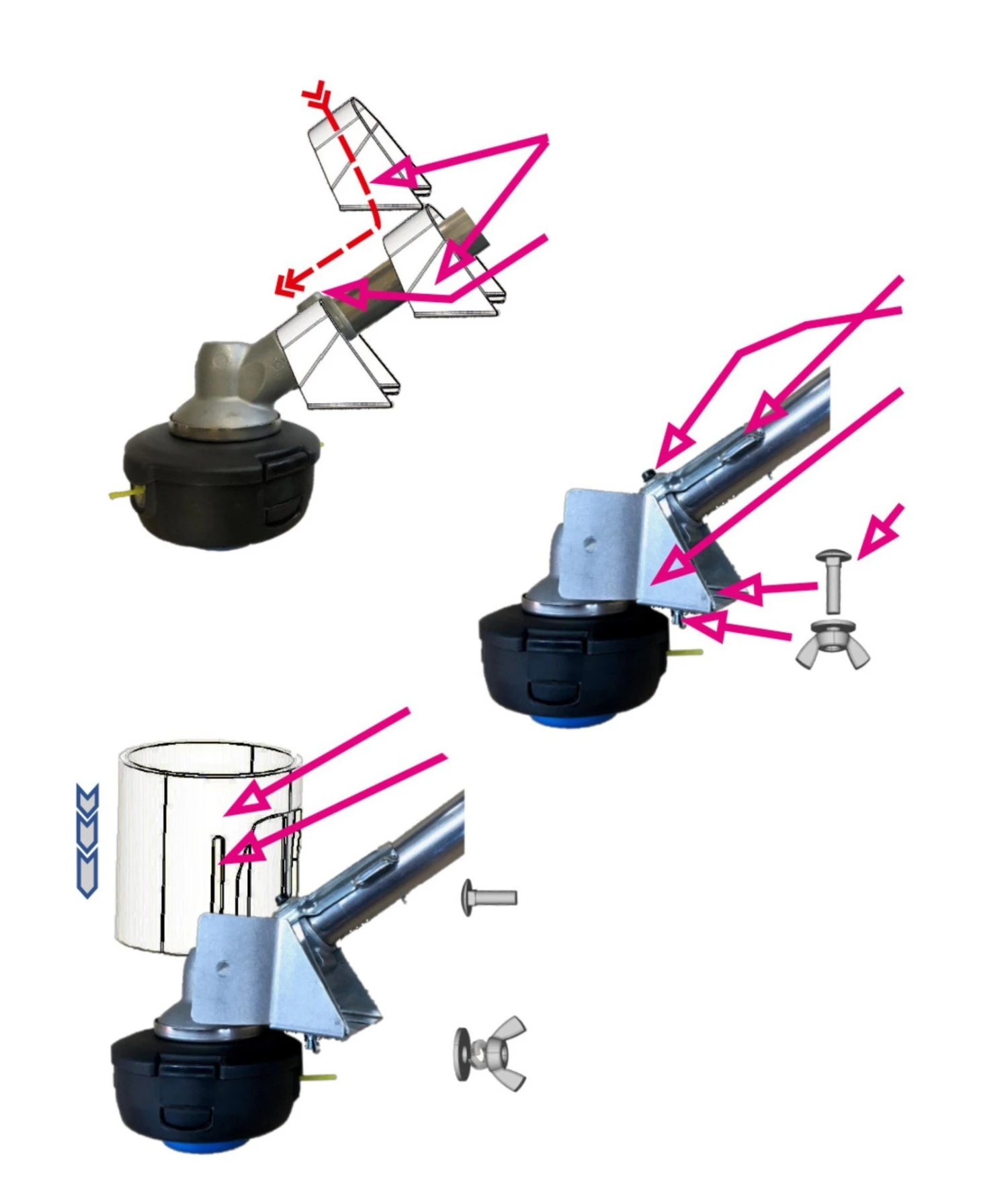 Pujota muoviputki trimmerin päähän välttäen suoraa kosketusta. Kiristä siipimutterit metalli- ja muoviosan välillä