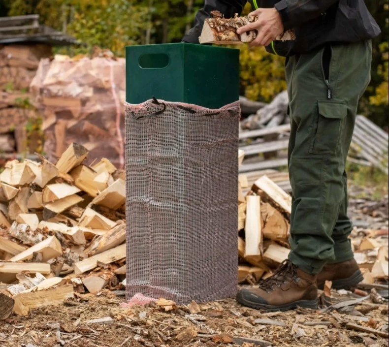 Tehokkaaseen ja yksinkertaiseen pakkaamiseen. Säkki laitetaan säkityssuppilon ulkopuolelle, jolloin klapit eivät jää kiinni verkkoon. Kun klapeja on tarpeeksi, suppilo vedetään pois säkistä. Näin ollen säkistä saadaan tasareunainen ja siistin näköinen.