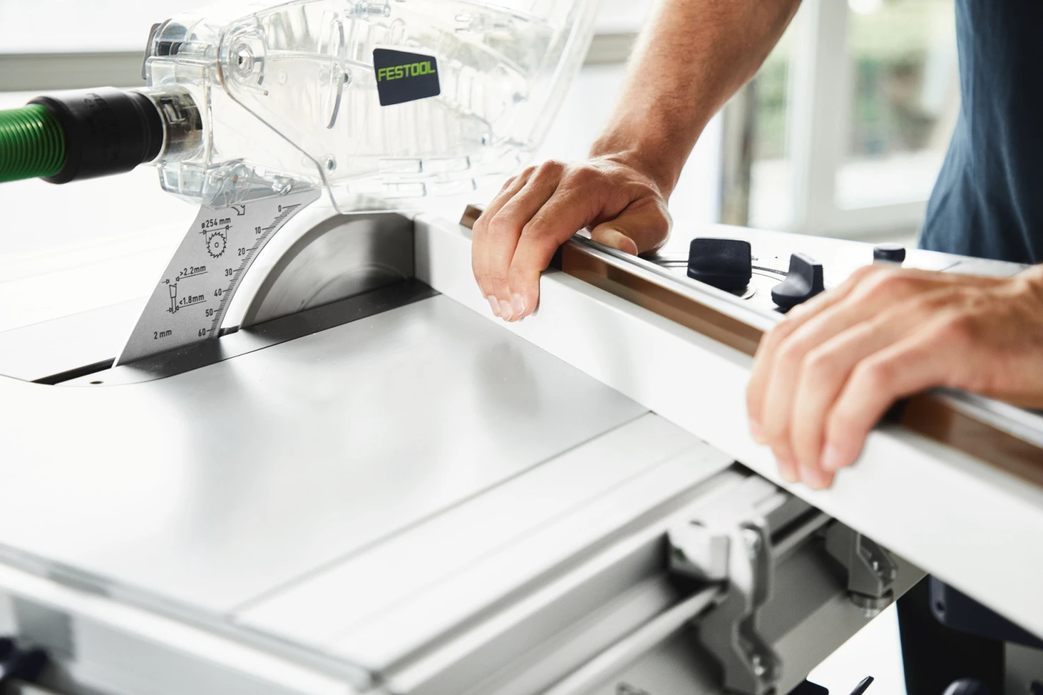 - Kätevä: 80 mm:n leikkauskorkeus, laajennettava työtaso, pitkittäis- ja kulmaohjaimet mahdollistavat joustavan työskentelyn ‒ myös suurten työkappaleiden yhteydessä