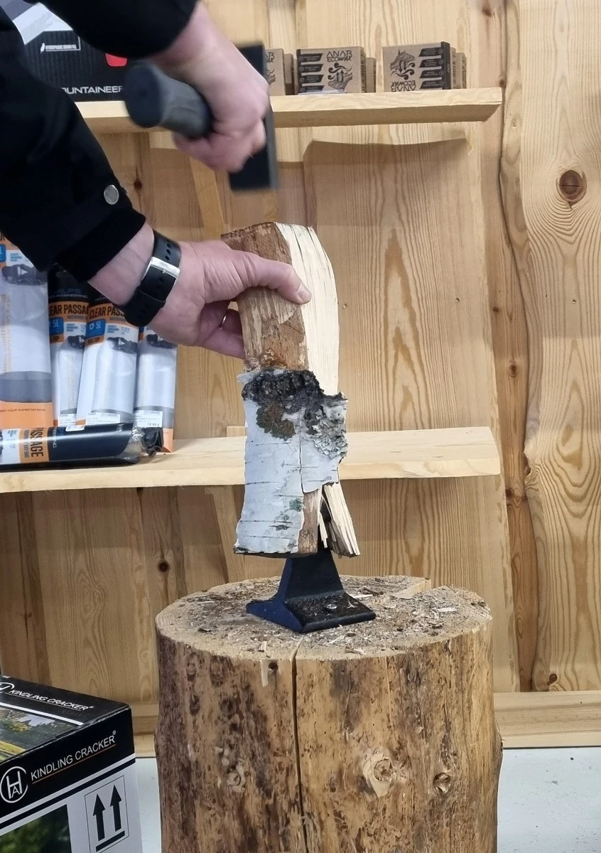 Ratakiskosta valmistettu Klapi halkaisukiila on oiva apuväline pienempien polttopuiden halkaisuun tai sytykkeiden tekoon. Telineen voit laittaa ruuveilla kiinni esim. halkaisupölliin, jolloin kiila pysyy hyvin paikoillaan. Puu asetetaan terän päälle ja puuta lyödään esim. moskalla, vasaralla tai toisella puulla, jolloin terä halkaisee puun nätisti.
