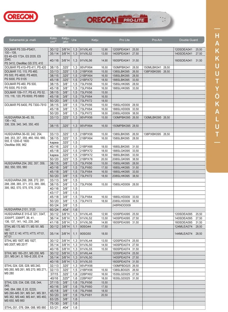 Suositellaan sähkösahoihin ja iskutilavuudeltaan korkeintaan 35 cm³:n polttomoottorisahoihin.