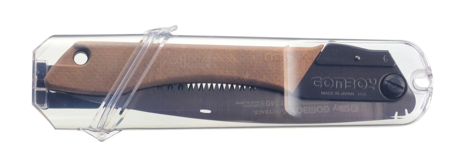 Silky Gomboy Curve Outback-Edition 240-8 on keskikokoinen taskusaha, jossa on taittuva terä. Sen terä on päällystetty mustalla nikkeli-tina-pinnoitteella, mikä parantaa terän kestävyyttä ja leikkaustehoa. Kaareva terä helpottaa paksujen oksien sahaamista, ja se voidaan lukita kahteen asentoon. Kahva on valmistettu puu-muovikomposiitista, joka tuntuu miellyttävältä kädessä myös kostealla ja kylmällä säällä.