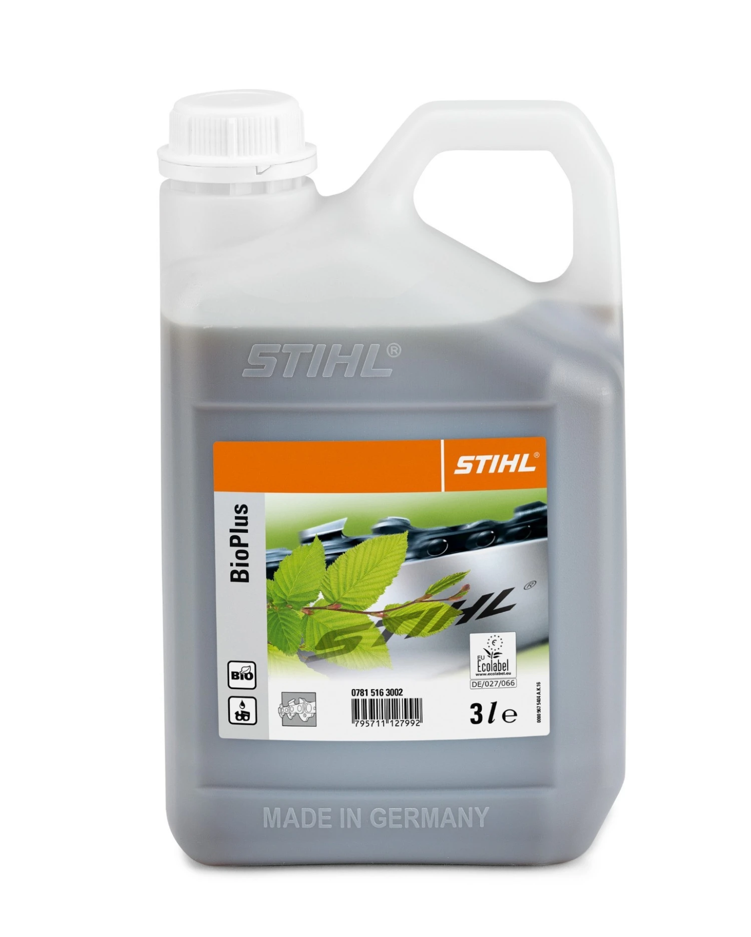 STIHL BioPlus -ketjuöljyllä on uskomattoman hyvä hapettumisen esto. Pitkän ajan käyttämättömyydenkin jälkeen karsaantuminen on lähes olematonta, ja öljy täyttää edelleen ympäristömerkin Blauer Engelin kriteerit. BioPlus on biohajoava ja luokiteltu vaarattomaksi, joten sitä voidaan käyttää vesiensuojelussa ja ekologisesti herkillä alueilla ilman ongelmia.